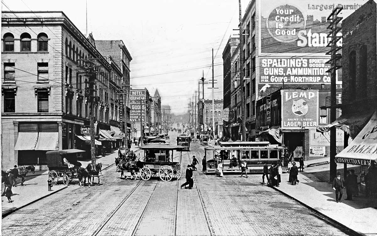 FIRST Madison-&-First-n.-thru-Madison-c.08-WEB December 21, 2014 1200 × 751 Seattle Now & Then: Poetry and Prose at 1st and Madison Looking north on First thru Madison Street with a cable car intersecting on the right. Note the sidewalk awning of the German Bakery, far right. The Globe Building is on the left at the northwest corner.