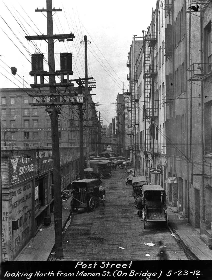 post – RAINER GRAND fm Post-Alley-n-fm-Marion-1912-WEB December 21, 2014 850 × 1124 Seattle Now & Then: Poetry and Prose at 1st and Madison Post Alley, looking north from Marion Street. The buildings on the right face the west side of First Avenue between Marion and Madison and so look across First Avenue and the featured block.