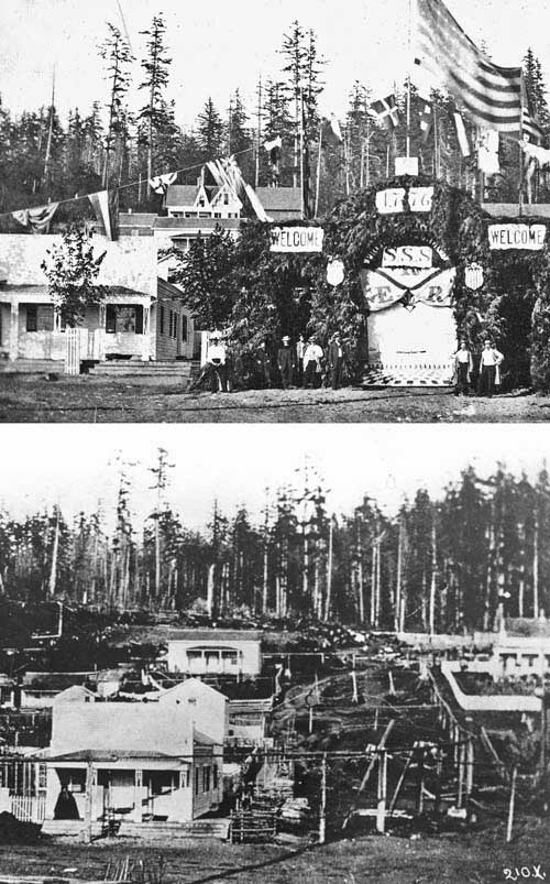 The bottom subject of this pair is the oldest surviving photograph of any part of Seattle. It is conventionally (and probably accurately too) dated 1859. It looks east towards First Hill over the Yesler home at the northeast corner of Front Street (First Ave.) and James Street, on the left. The mid-1860s subject above it includes the ornate west facade of the Terry home at 3rd and James. Note that the timberline around Fifth Avenue if nearly the same between the two photographs. This suggests that at some point before 1859 the clearing of the forest in this earliest neighborhood stopped – for a spell.