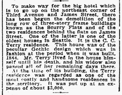 ST-Feb-4,-1906-Terry-home-to-be-razed-WEB January 11, 2015 500 × 389 Seattle Now & Then: The Terry House at 3rd & James A Seattle Times announcement on Feb. 4, 1906 that the C.C. Terry house with its “peculiar Gothic design” was being demolished.