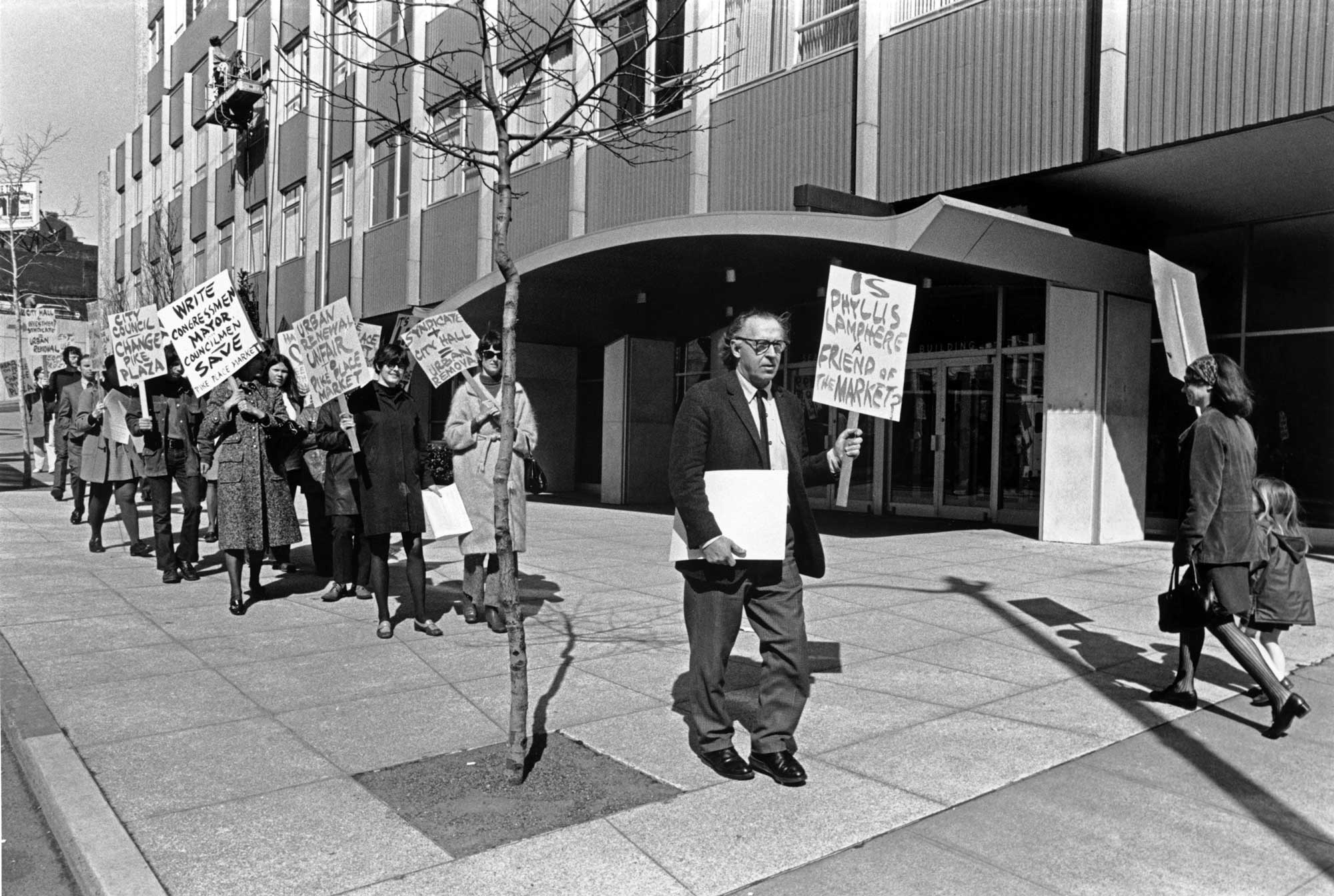 THEN: Friends of the Market president, architect Victor Steinbrueck, leads a cadre of Friends marching for Market preservation in front of the Seattle City Hall most likely on March 18, 1971. (Photo by Tom Brownell from the Post-Intelligencer collection at MOHAI)