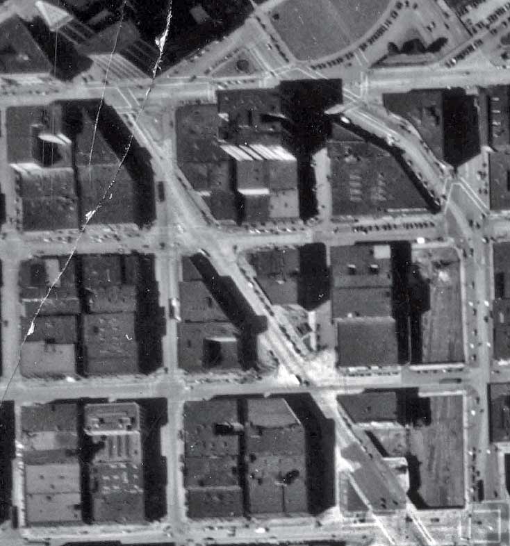 A detail from the 1936 aerial map-survey of Seattle. Yesler Way is at the top, Jackson St. at the bottom, and the Second Avenue Extension clearly cuts between them. The two triangles – east and west – are found just below the middle of the subject. (Courtesy, Seattle Municipal Archive)