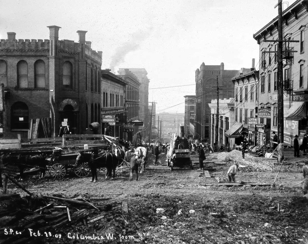 Columbia Street, looking west thru Third Avenue during the latter’s 1907 regrade. The post office has moved on to First and University, and will soon be moving further into its headquarters at Third and Union. The next photo is earlier and shows the P.O..