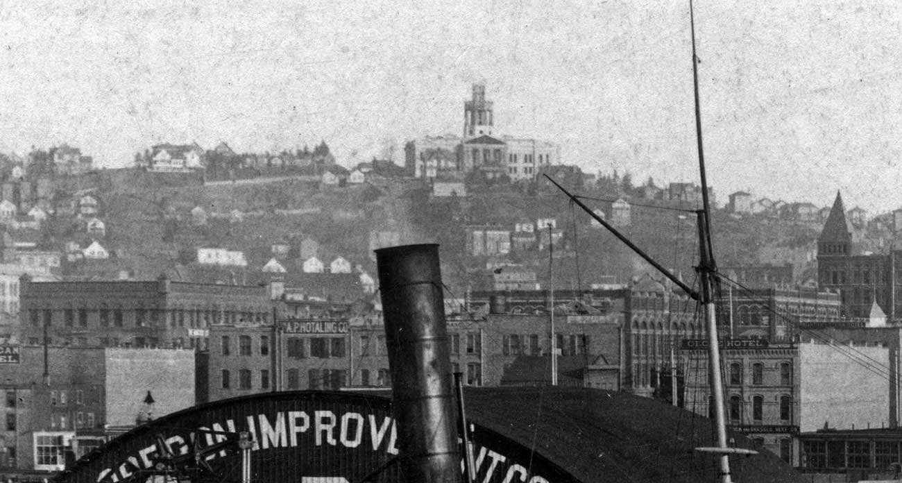The Boone home appears i this ca.1890 look east from the King Street Wharf to the First Hill horizon and the Construction there of the King County Court House. The big home is in the half hidden in trees and its own dark covering at the lower-right (northwest) corner of the Court House. The dark spreader leaning left from the mist on the right points directly at and on the Boone home. The Terrace streets steps to the Court House seem to emerge from the smoke stack at the subject’s center.