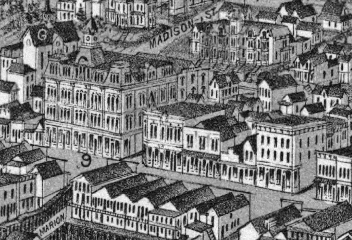 A detail selected from the 1884 Birdseye of Seattle to look down at the intersections of Front Street (First Ave.) and Marion (left w. “9” written on it) and Colubmia, right. In 1884 the northwest corner of Marion and Front was grandly improved with the Frye Opera House, which kitty-korner the future site for the Colman Building was a long line of commercial sheds given a sometimes unifying front facade. From the bottom of this detail to two block east at Second Avenue, the 1889 fire consumed it all.