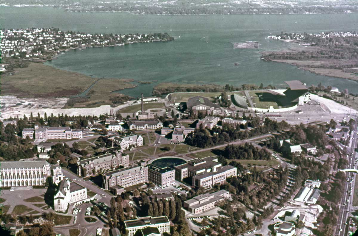 z-Ellis–color-aerial-of-U.W-WEB March 22, 2015 1200 × 793 Seattle Now & Then: Anderson Hall An Ellis aerial looking east over the UW campus