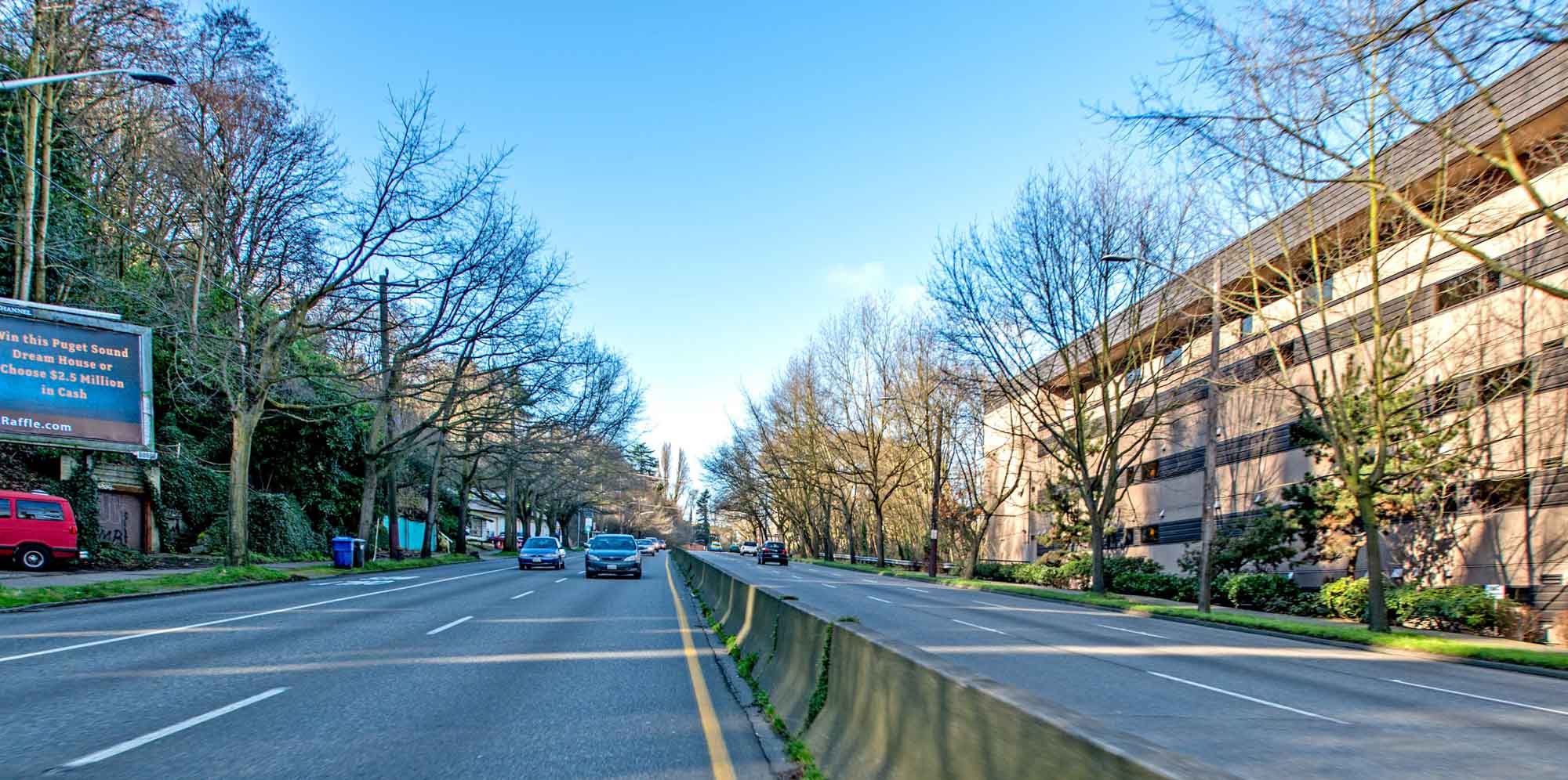 NOW: In the mid-1970s the three- mile long “Jersey Barrier,” named for the state where it was first used, was installed down the center-line of Aurora Avenue, north of the Battery Street subway, to the southern boundary of Woodland Park. Each of the barrier’s pre-cast 20-foot long segments weighed about three tons.