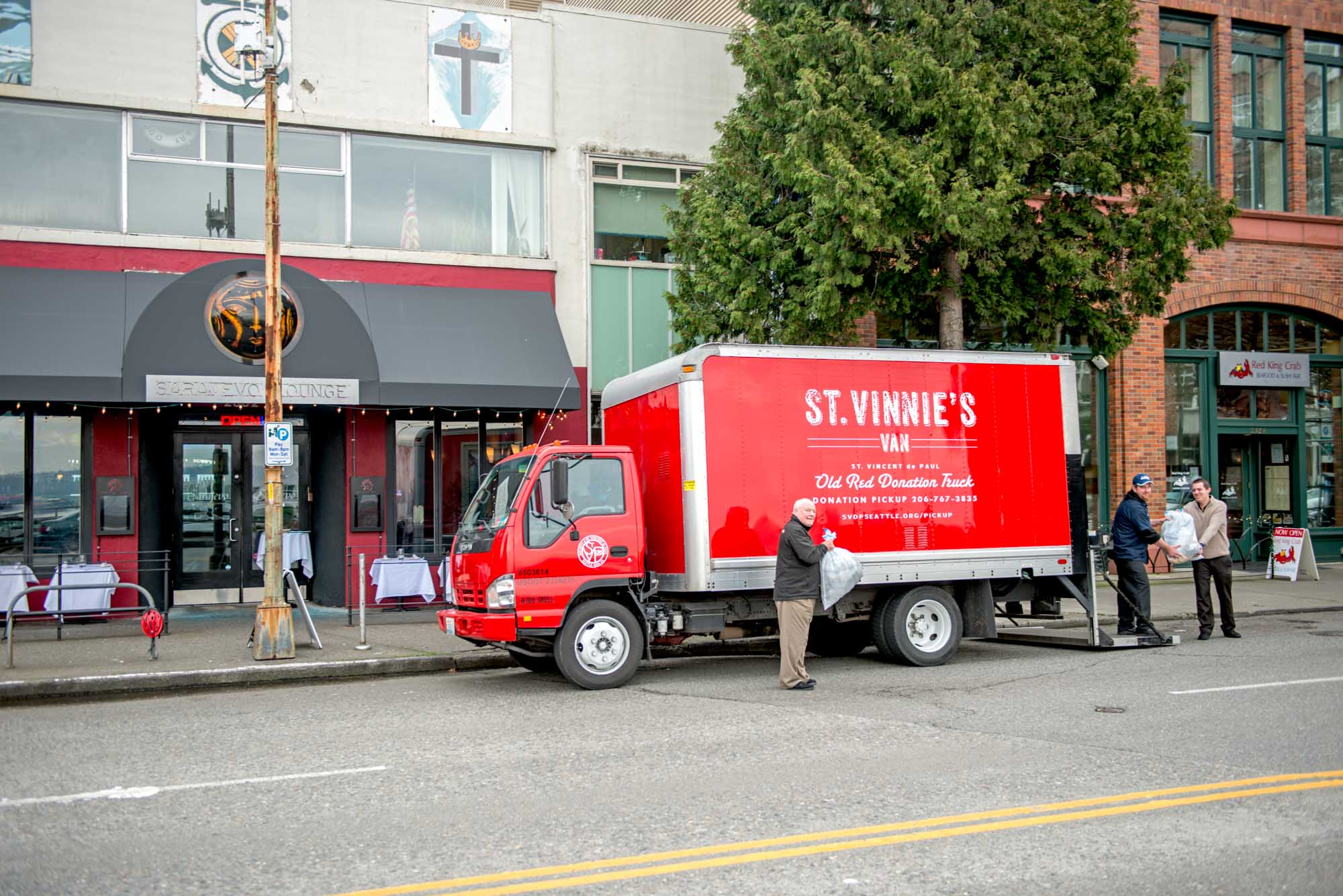 NOW: One of the four St. Vinnie’s red trucks now running picks up some donations from the proprietors of the Sarajevo Lounge, a trendy Belltown Balkan dining establishment at the corner once home to St. Vincent de Paul’s first storefront thrift store.