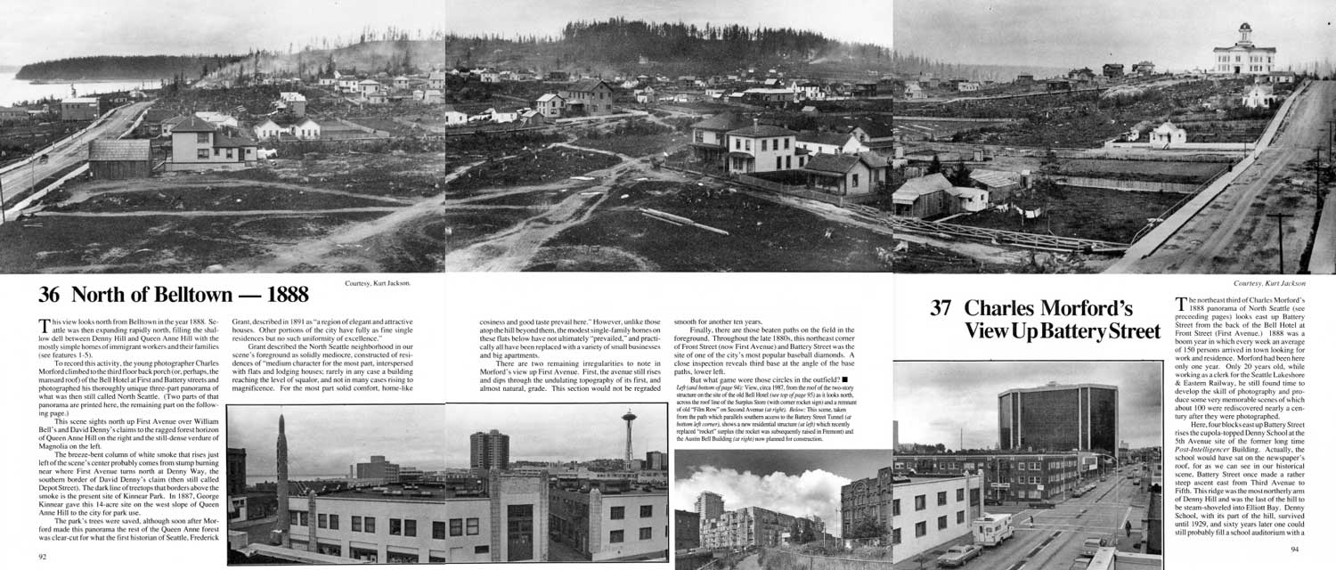 A panorama of three photos taken by Charles Morford in 1887-88. Someday we will narrow it down. The photos were taken from the rear of the Bell (or Bellview) hotel. If you click the pan you should be able to read the text. That’s Queen Anne Hill on most of horizo, and Battery Street leading east on the right with the Denny School (1884) at the northeast corner of 5th and Battery.