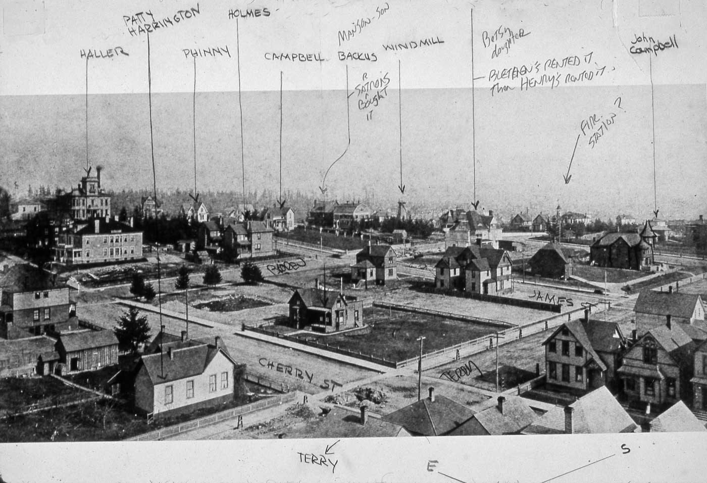 Our last look down from the Coppins tower. This view looks to the southeast. The markings were made with the help of Carrie Campbell Coe, my primary informant on life on First Hill as the end of the 19th Century when she lived kitty-korner to the Haller Mansion. Included among Carrie’s marks are the Haller home on the far left.