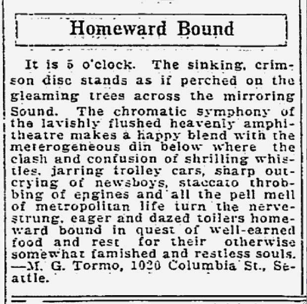 HOMEWARD-BOUND-by-Tomo-WEB April 19, 2015 620 × 615 Seattle Now & Then: First Hill Row Houses About a century ago a worker named N.G.Tormo took up the Seattle Times offer to contributed some “creative writing” for publicaition in the paper, and the paper did it. Tormo lived in our – or rather his row house at 1020 Columbia.