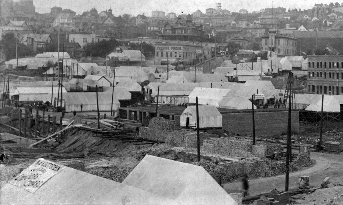 Some of the same tents and brick piles show in this view that looks northeast across Main Street to Second Ave. (Occidental Ave.). The County Courthouse at Third and Yesler appears on the right and the Yesler Mansion on the east side of Third, high-center. Part of Central School at Madison and 6th Ave. , fills the upper-left corner. (Courtesy, MOHAI)