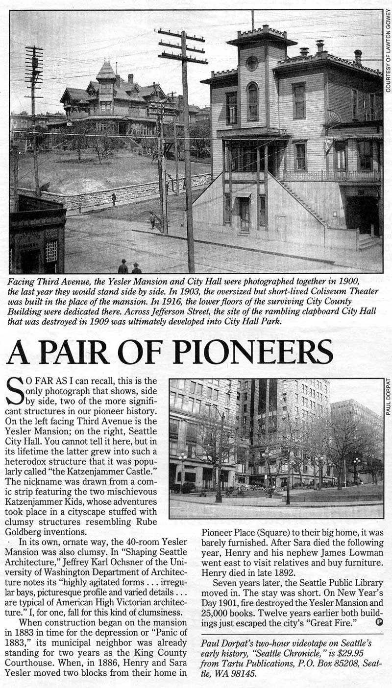 Pioneer-Pair-Katz-&-Yesler-3-21-02-web July 11, 2015 800 × 1405 Seattle Now & Then: The Seattle Fire, Three Weeks Later This “pioneer pair” with the Yesler Mansion on the left and the Katzenjammer on the right, first appeared in Pacific on March 21,2002.