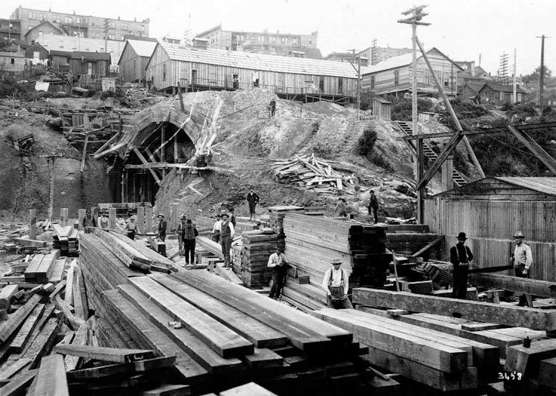 clip-Tunnel-Construction-fm-below–WEB July 18, 2015 1137 × 811 Seattle Now & Then: Fire Below the Market Work at the north portal, ca. 1903-4. The tunnel workers’ dormitories are lined up above the opening. Later the Municipal Market Building would nestle on that ledge.