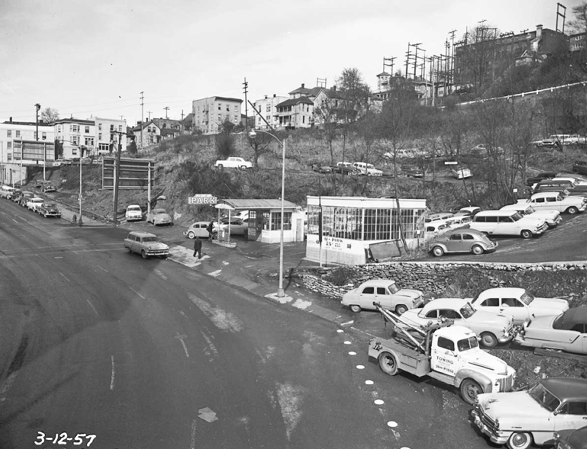 muni-3-12-57-lk-n-fm-Yesler-on-5-WEB August 23, 2015 1194 × 914 Seattle Now & Then: The Frances Hotel (aka 5th Avenue regrade) March 12, 1957, looking north on Fifth Avenue from the Yesler Way overpass into part of the sprawling and steep parking lot developed on the shaky acres once home to the tenements on Fifth Avenue’s east side. Courtesy, Seattle Municipal Archive.