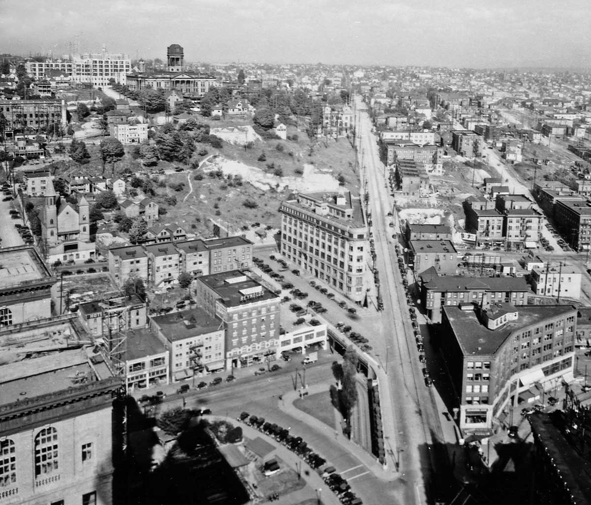On the horizon Harborview Hospital is under construction and the top of King County’s abandoned courthouse has been removed in prelude to it razing. This 1930 look from the Smith Tower also shows off the barren or cleared acres top-center and behind the flat-iron shaped 400 Yesler Building at the center. Our Lade of Good Help is on the left.