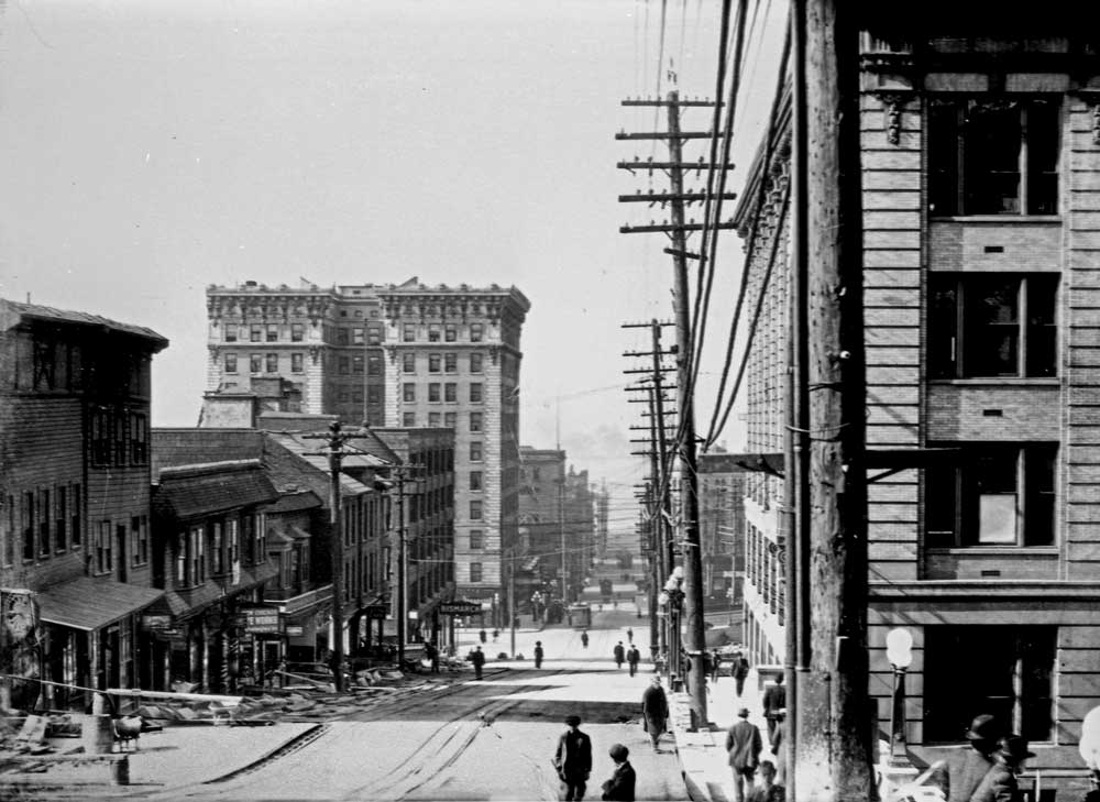 Yesler-Way-lk-w-from-5th-ave-overpass-ca-1912-WEB August 23, 2015 1000 × 729 Seattle Now & Then: The Frances Hotel (aka 5th Avenue regrade) Looking west on Yesler Way overpass above 5th Avenue, ca. 1912.