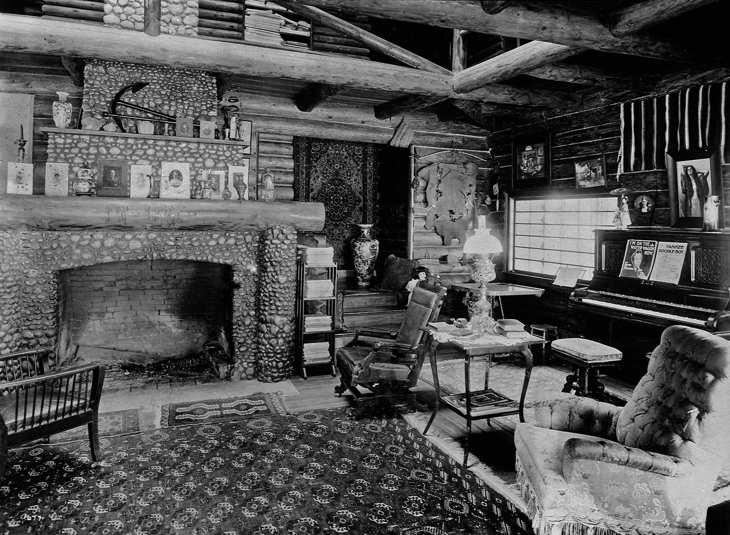 THEN: Included among the several detailed photos taken for the Bernards of their new and yet rustic Fir Lodge, was this one of the living room with its oversized fireplace and the piano on which Marie, their older daughter, learned to play well enough to concertize. (Courtesy Doris Nelson)