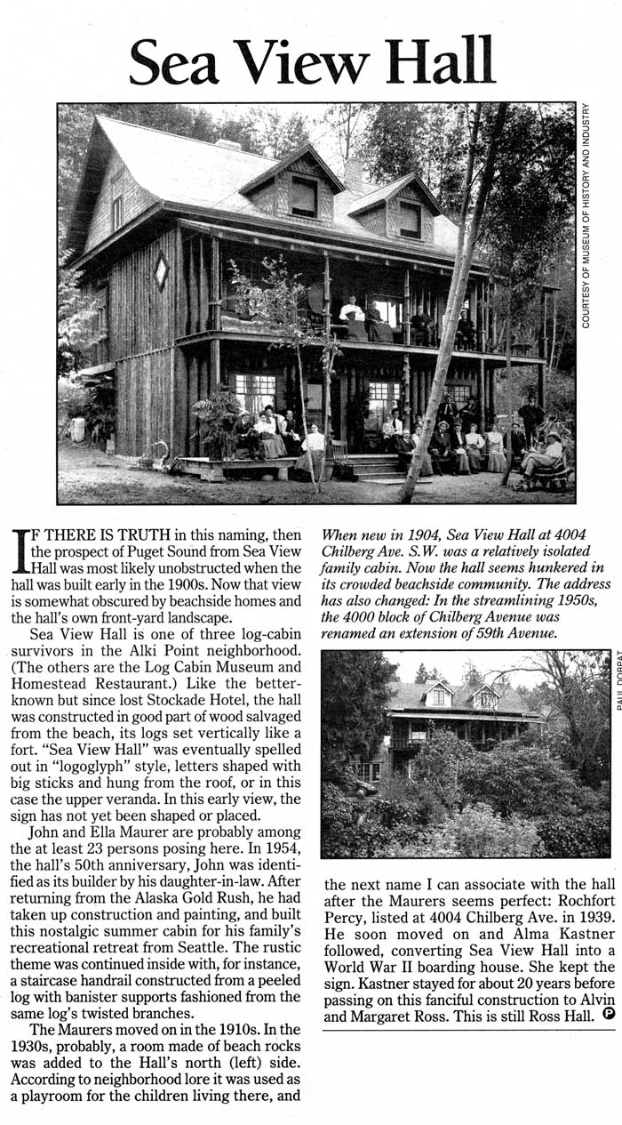 ST-1-23-2000-Sea-View-Hall-WEB August 30, 2015 700 × 1265 Seattle Now & Then: Return of the Homestead A surviving log construction, Sea View Hall is off South Alki Beach. (First appeared in Pacific, Jan. 23, 2000)