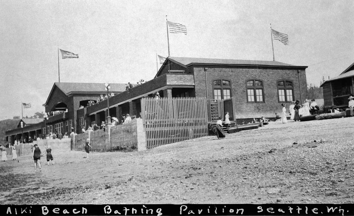 Alki-Beach-Pav-ca-15-WEB September 5, 2015 1200 × 732 Seattle Now & Then: Schmitz Park Bath House (aka Pavilion) from the beach at a low tide. The day may be hot, but it is also windy. (Courtesy, North Idaho Historical Museum)