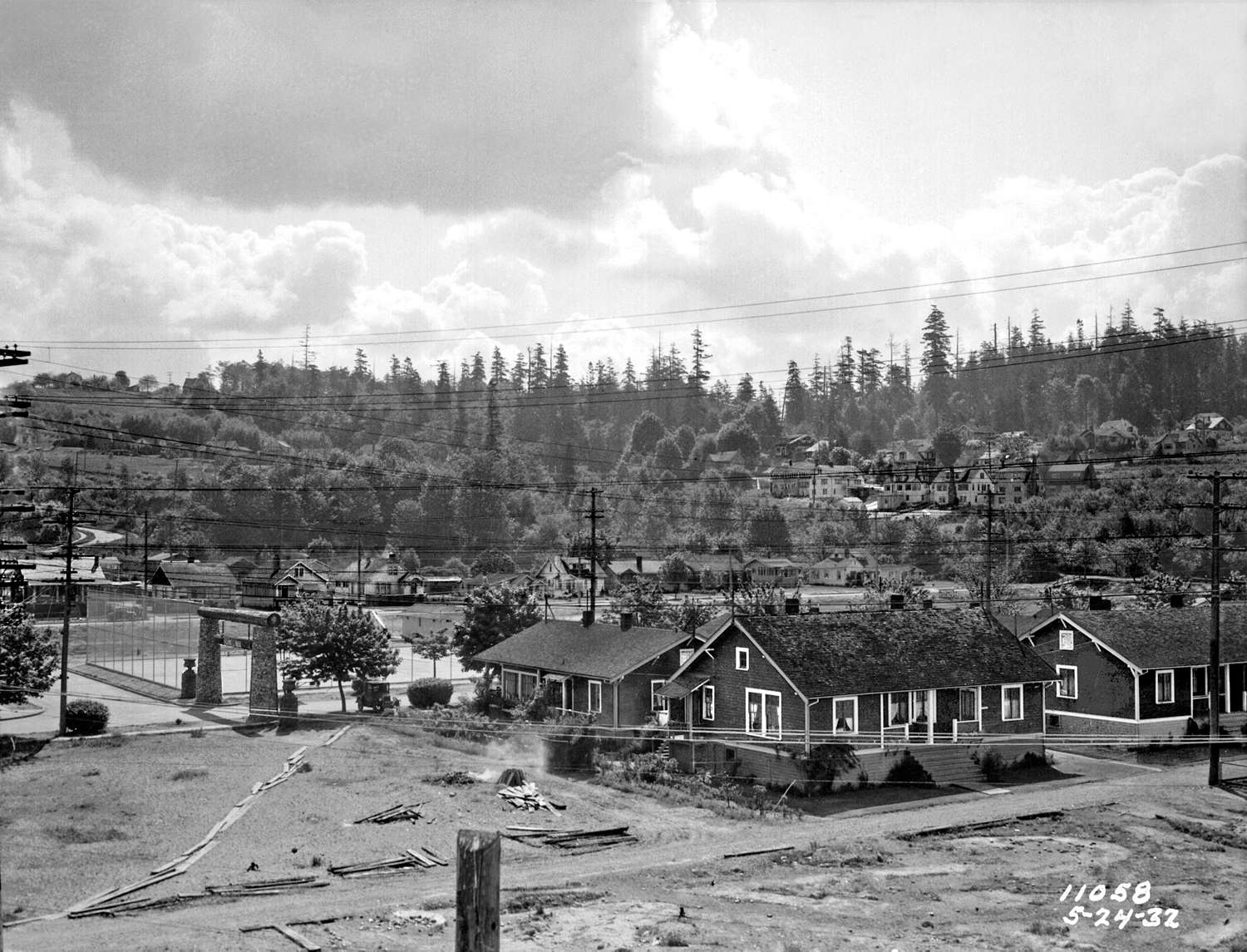 THEN: Looking southeast from above Alki Avenue, the Schmitz Park horizon is serrated by the oldest trees in the city. The five duplexes clustered on the right were built 1919-1921 by Ernest and Alberta Conklin. Ernest died in 1924, but Alberta continued to live there until well past 1932, the year this photograph was recorded. (Seattle Municipal Archives.)