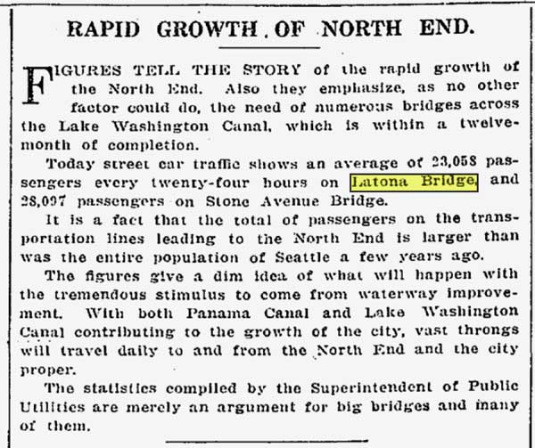 8. STimes-11-20-1913-Traffic-on-Latona-BridgeWEB September 13, 2015 600 × 503 Seattle Now & Then: The Wallingford Wall at the Latona Knoll Traffic on the Latona Bridge as reported in The Times for Nov. 20, 1913, six years before being replaced by the nearby University Bridge.
