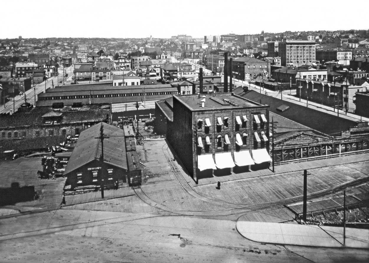 Here, circa 1909, we can find both the featured Row, far right, and the Electric Company plant filling most of the mid-ground subject. Westlake Ave. is here cut through the neighborhood at the bottom. Capitol Hill is on the east horizon, with Broadway High School at the center. The car barns on the right at the northeast corner of Fifth Avenue and Pine Street have not yet been remodeled for the Westlake Market, which can be found in the photo that follows this one.