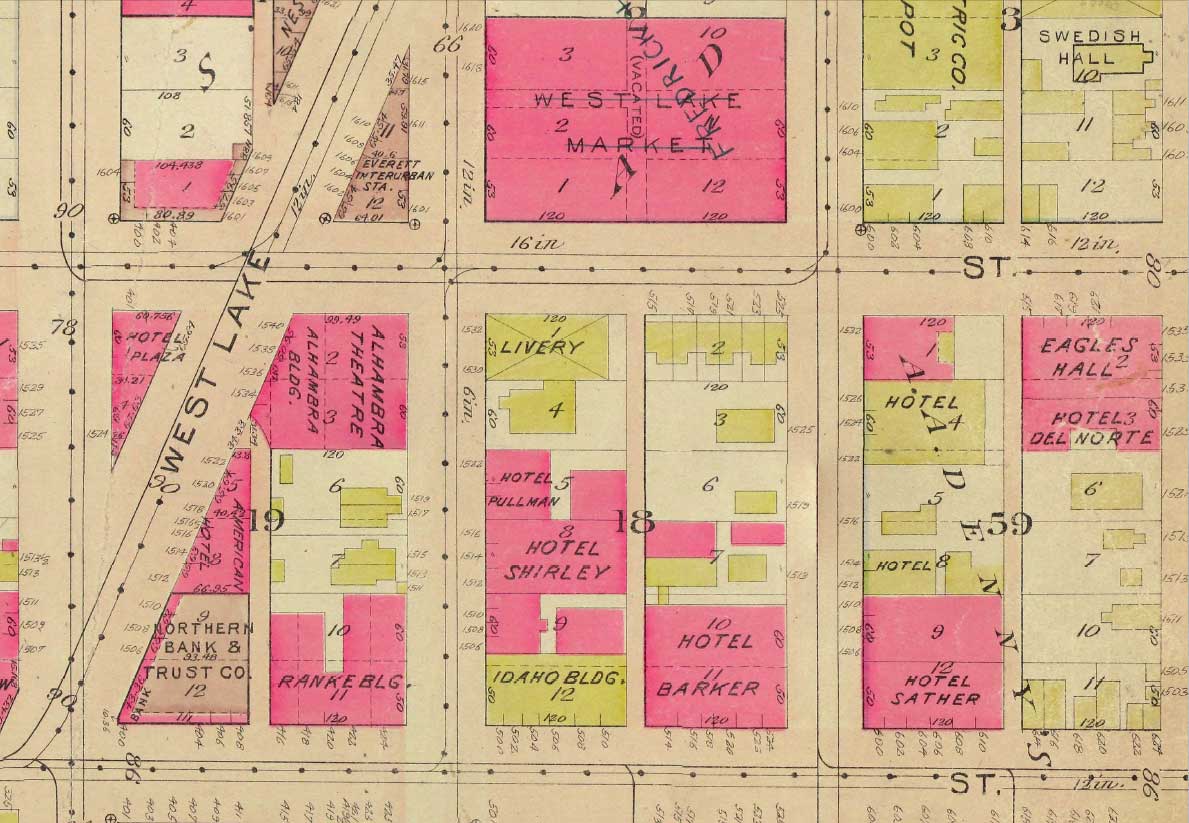 z Baist-6-Pine-GRABWEB September 26, 2015 1189 × 823 Seattle Now & Then: A Row House at 6th and Pine The 1912 Baist shows our Row, the six year old Westlake Ave. cut, and the trolley yard and barns converted into the Westlake Market.