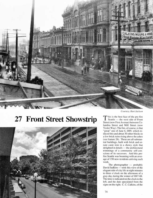 The first of two pages for the 27th feature included in the book Seattle Now and Then Volume Three. To read the second page find the history books bug on the front page of this blog and call it forth. For this look along the Front Street show strip the photographer took a balcony near Columbia Street. (Courtesy, Kurt Jackson)