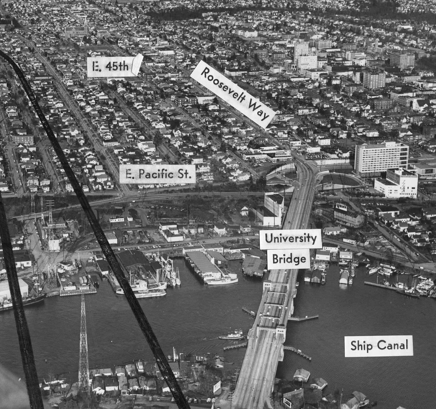 Thanks, again, to Ron Edge for another aerial, this one marked with the line or path of the then planned I-5 Freeway bridge over the Portage between Lake Union (proper) and Portage Bay. Can you – by now – find the underpass on 6th NE, the underpass on Campus Parkway, the Applied Physics Laboratory, and the odd intersection of 7th Ave. NE and NE 40th Street?