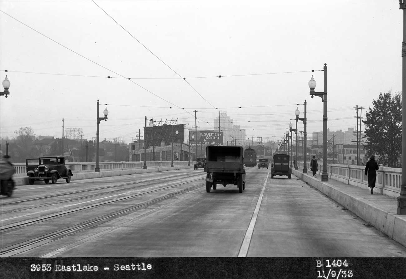 Looking north on the University Bridge from near the bascule. Nov. 9, 1933. The address at the base of the photo’s own caption refers to the billboard at the scene’s center, and not the photographer’s prospect. This is another Foster-Kleiser photo. Might that be the photographer’s coupe on the far left, with the open door?