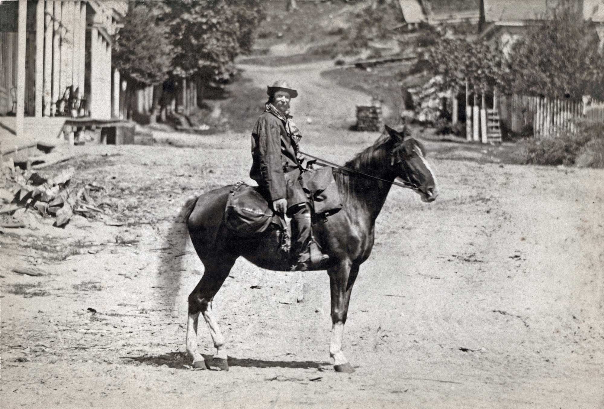 DUTCH-Ned–then November 21, 2015 2000 × 1353 Seattle Now & Then: Dutch Ned THEN: Pioneer mailman Dutch Ned poses on his horse on Cherry Street. The ca. 1880 view looks east over First Avenue when it was still named Front Street. (Courtesy: The Museum of History and Industry, aka MOHAI)