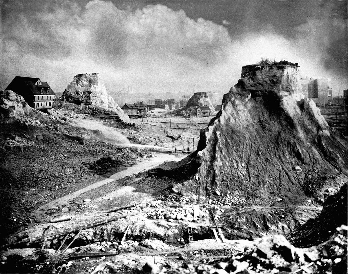 This is the run-away sensational classic of Denny Regrade shots. The photographer was the prolific A. Curtis, brother of Ed Curtis. The view looks south from near 4th and Bell, and so through our featured intersection, which once held the summit of Denny Hill oe block north of this prospect.
