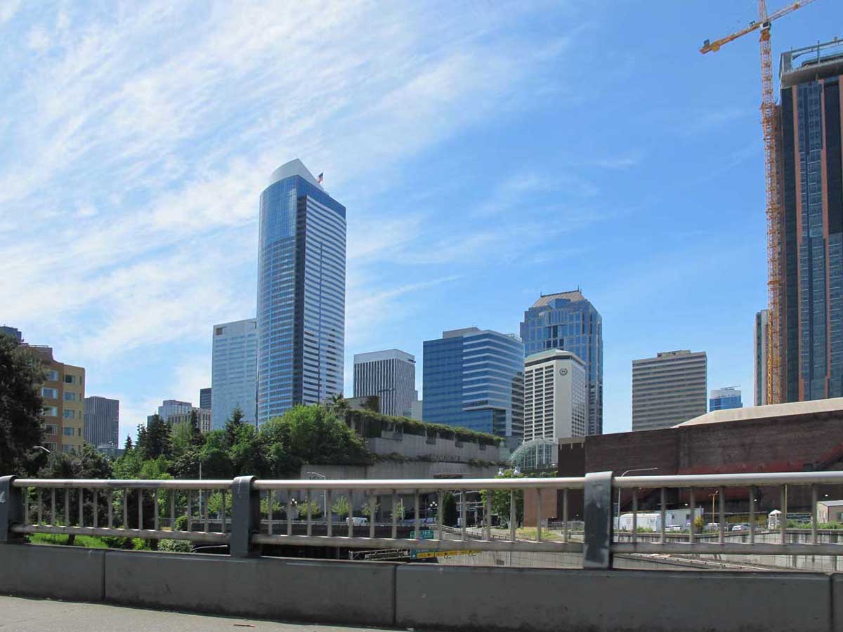 Climbing First Hill in 1914 for a visit with Rod Edge with Rich Berner at Skyline, I snapped this from the passenger’s side while crossing above the I-5 ditch. This is near (or at) the Prince Rupert’s front door. Note the landscaped roof of the Convention Center just above the railing. The tree on the far left is part of the landscape of Plymouth Park at the northwest corner of Pike and Boren.
