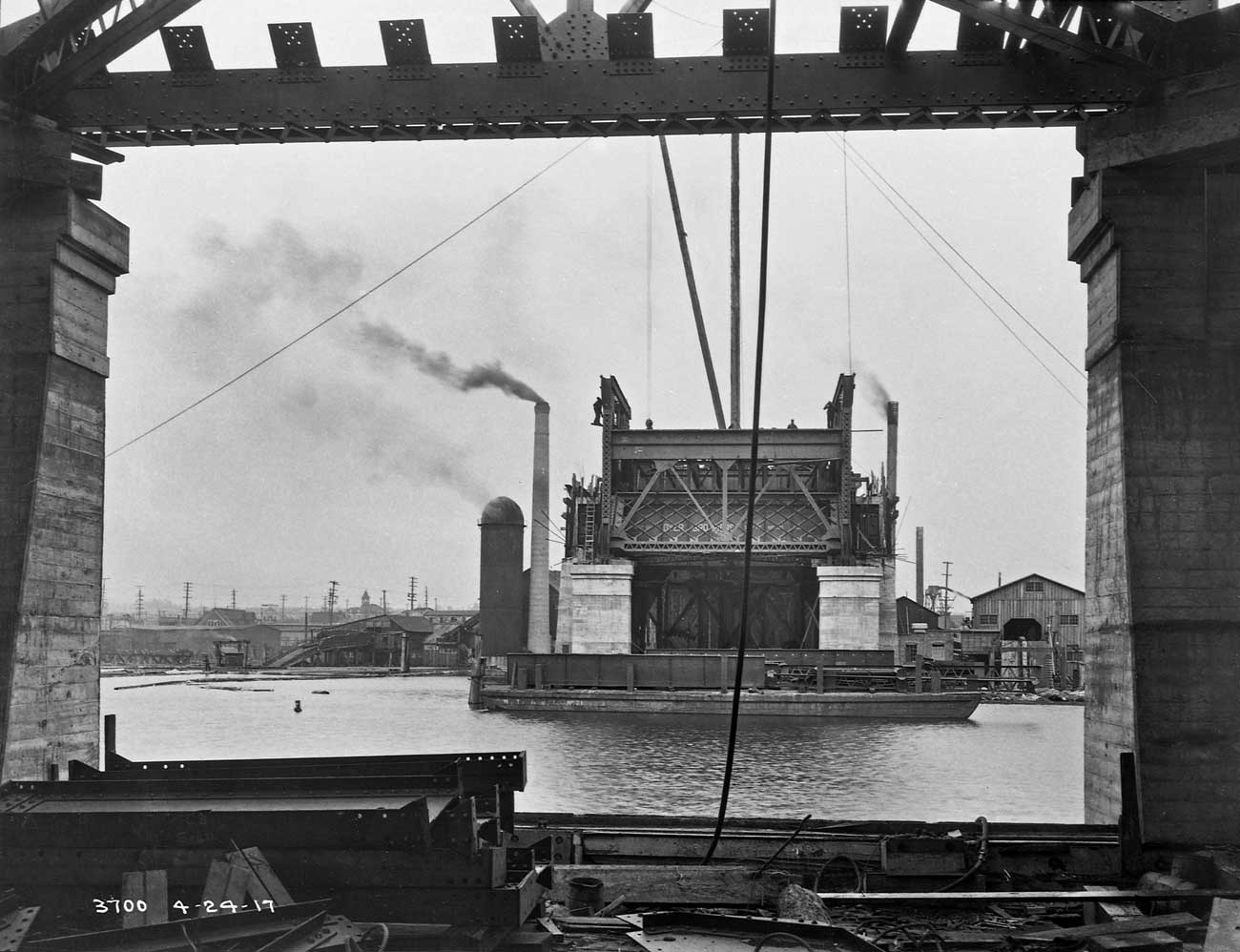 Dated April 24, 1917, the piers, north and south, are up, but not the teeter-totter wings for the bascule, and the bridge would consequently not be ready for the Lake Washington Ship Canal’s July 4, 1917 inaugural opening. Again – as noted in the caption above this one – note that the burning tower and chimney on the left and the metal warehouse on the right, both appear in the earlier photo above this one. This photo then was our primary clue for locating the photo above it.