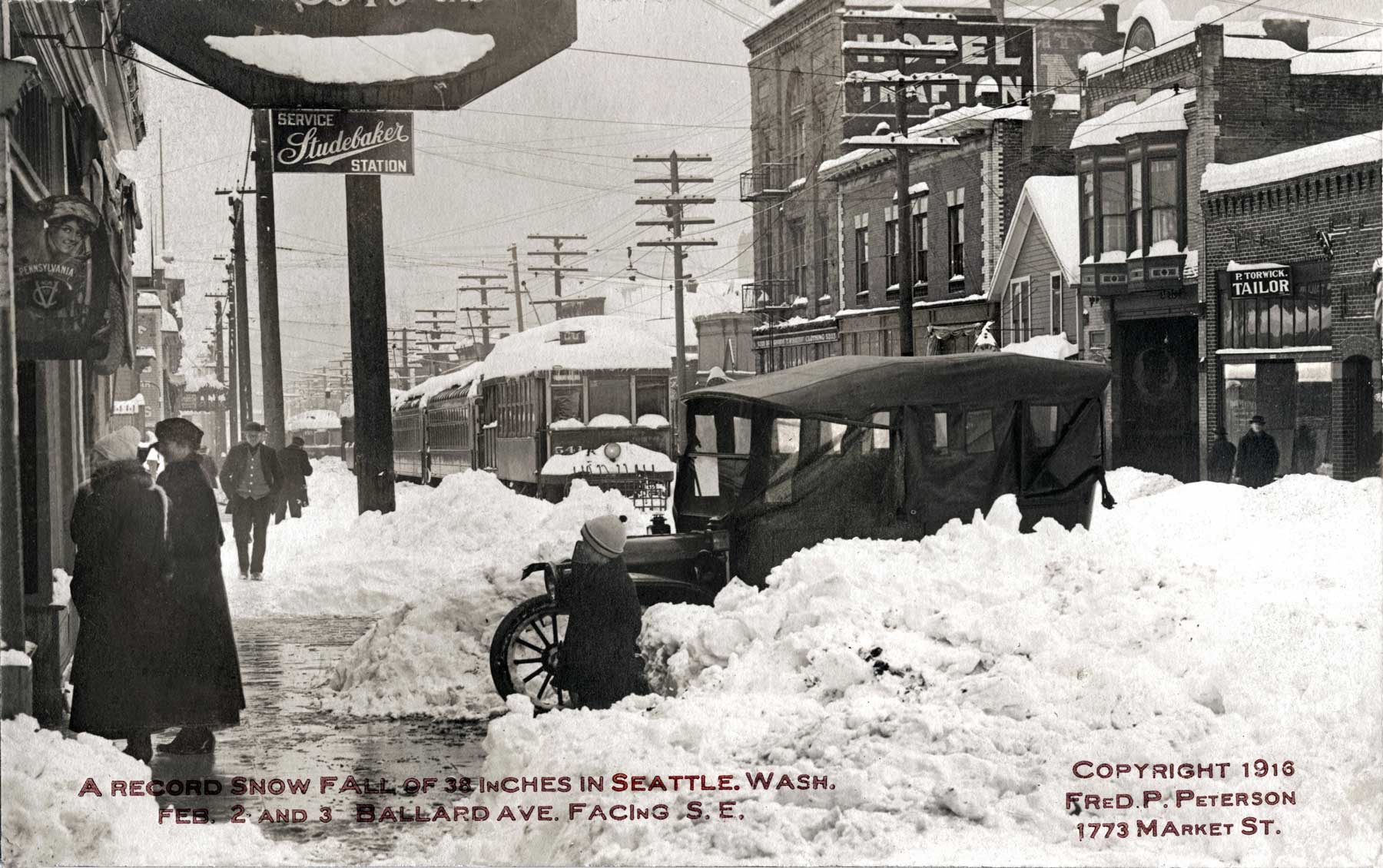 1916-big-snow-onBALLARD-AVE.-MR-then- February 20, 2016 1800 × 1130 Seattle Now & Then: Big Snow in Ballard, 1916 THEN: Ballard photographer Fred Peterson looks south-southeast on Ballard Avenue on February 3rd or 4th, 1916. (Courtesy, Museum of History and Industry)