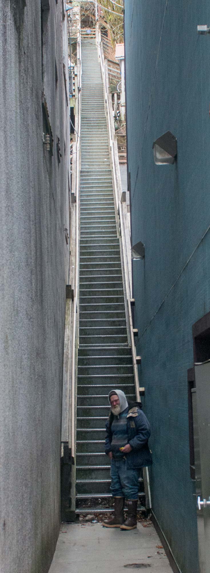 DSC_8862 February 28, 2016 735 × 2000 Seattle Now & Then: Seward Street, Juneau, Alaska A citizen of Juneau contemplates one of many stair climbs leading out of the central business district