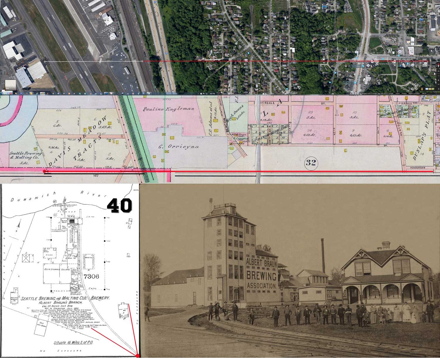 A detail of the 1893 Sanborn map is printed in the bottom-right corner. Running left-right through the middle of the montage is a detail from the 1912 Baist Real Estate Map, and on the top is a detail from the current GoogleEarth space shot of the old brewery site. (Thanks to Ron Edge for assembling this.)
