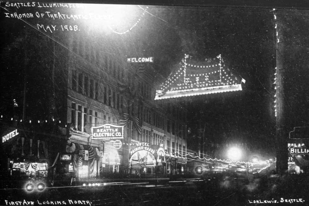 X-1908-ELECTRIC-SIGN-F-FLEET-WEB April 24, 2016 1000 × 668 Seattle Now & Then: The Great White Fleet, 1908 One of the most-favored decorations was the illuminated battleship hung above First Avenue between Marion and Madison Streets. Its sponsor, the