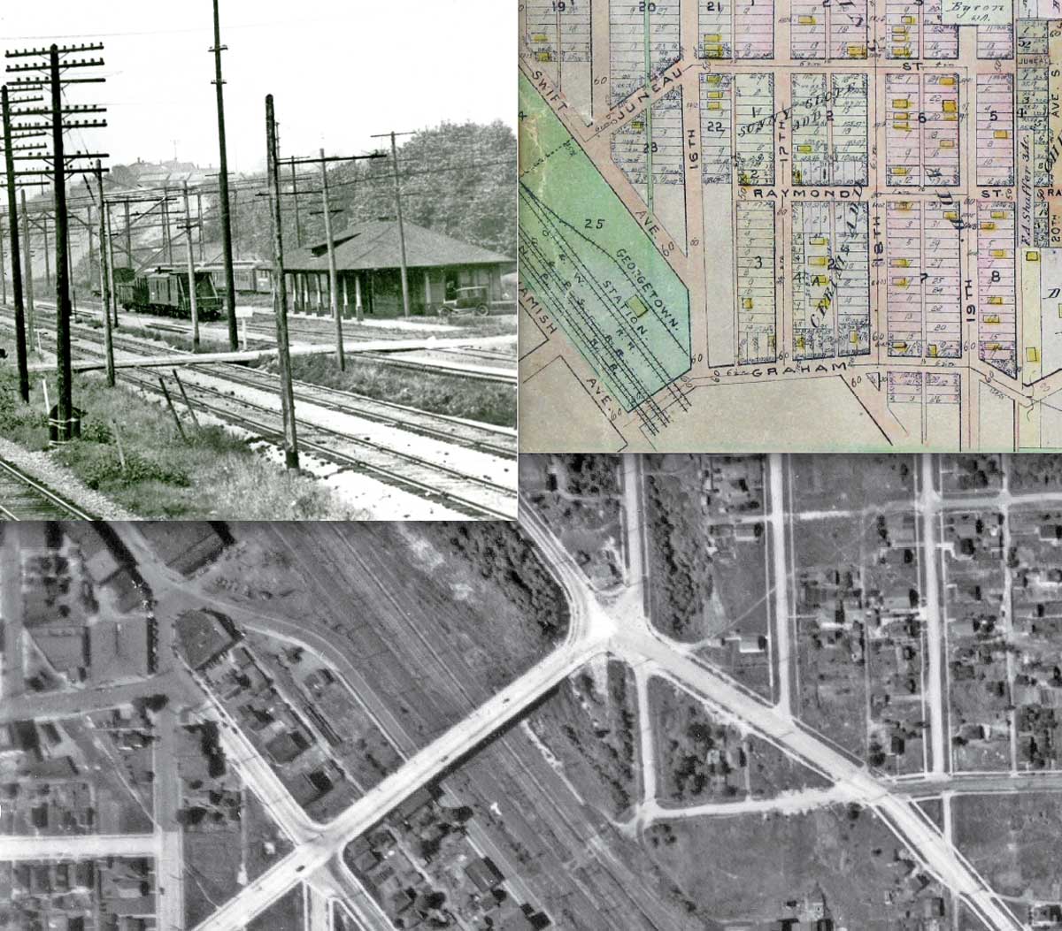 Here, again, upper-left is the planked Graham Street crossing the tracks into Georgetown. It is found at the bottom of the 1912 map, upper-right. There too can be found the promised footprint on this detail from the 1912 Baist Real Estate Map. The aerial at the bottom has been “covered” above.