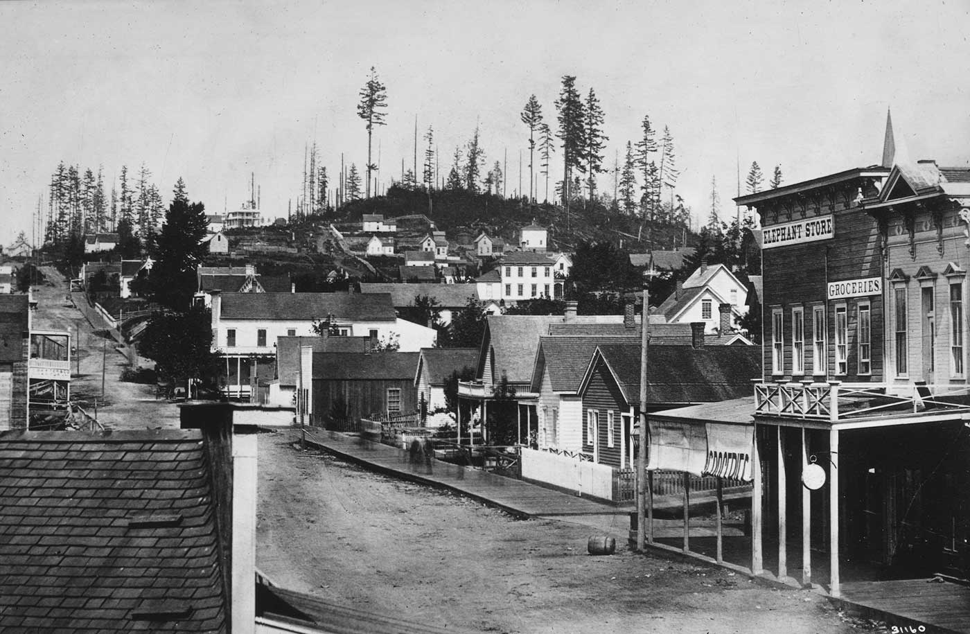 Looking north on Front Street (First Avenue) from the front second floor window of the Peterson & Bros Studio at the foot of Cherry street. The date is 1878 and the hill on the horizon is Denny, although its principal owner, Arthur Denny called it Capitol Hilll in hopes of luring the state capitol from Olympia to this his hill.