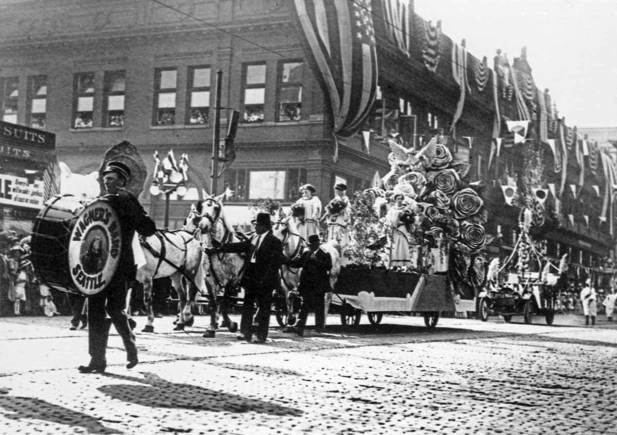 z-Potlatch-Parade-flower-float-Madison-2nd-w-Drummer-Wagner’s-band-web June 12, 2016 1200 × 846 Seattle Now & Then: Music at Commercial and Main