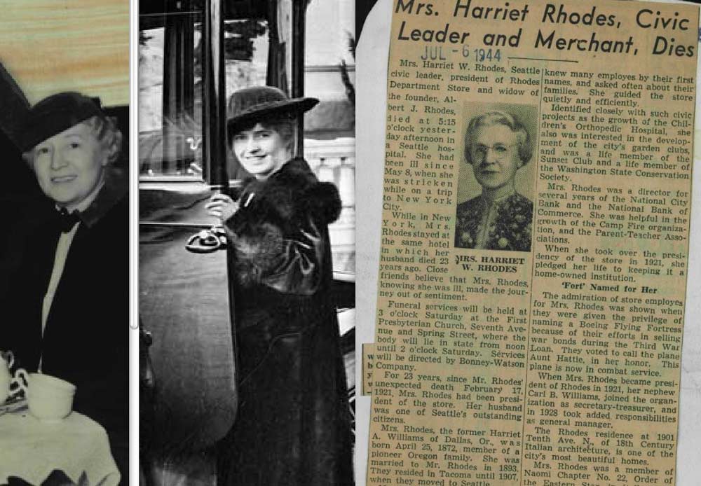 THREE-Harriet-Rhodes—3-times-I-think-WEB July 3, 2016 1000 × 694 Seattle Now & Then: The Rhodes Mansion (with 2 Electric Cars) Here, we believe, are three of Harriet Rhodes. You can agree or not or remain puzzled by comparing the detail from the featured photo, at the center, with the identified portraits of Harriet to the left and right.