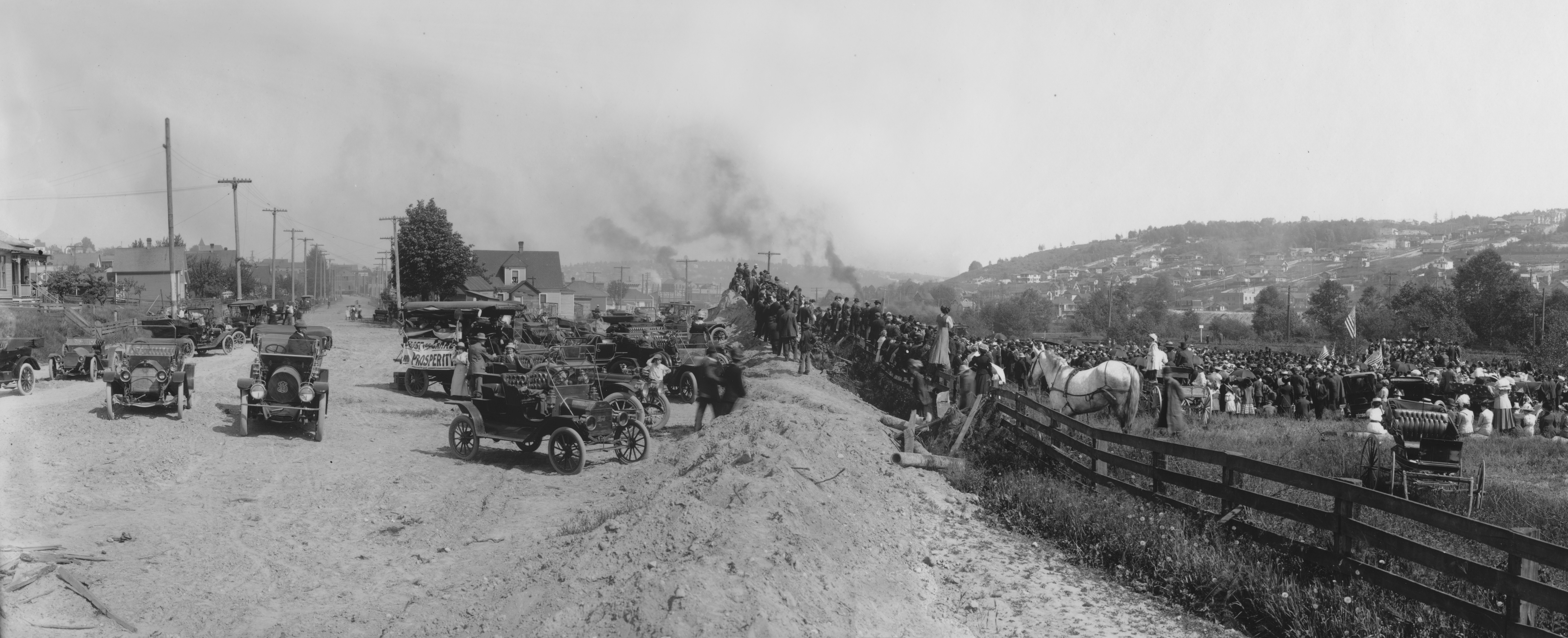 THEN: This panorama could have used a tower (or drone) to better survey the size of the June 1, 191l, crowd gathered in Fremont/Ross to celebrate the beginning of construction on the Lake Washington Ship Canal. (Courtesy, Museum of History & Industry)