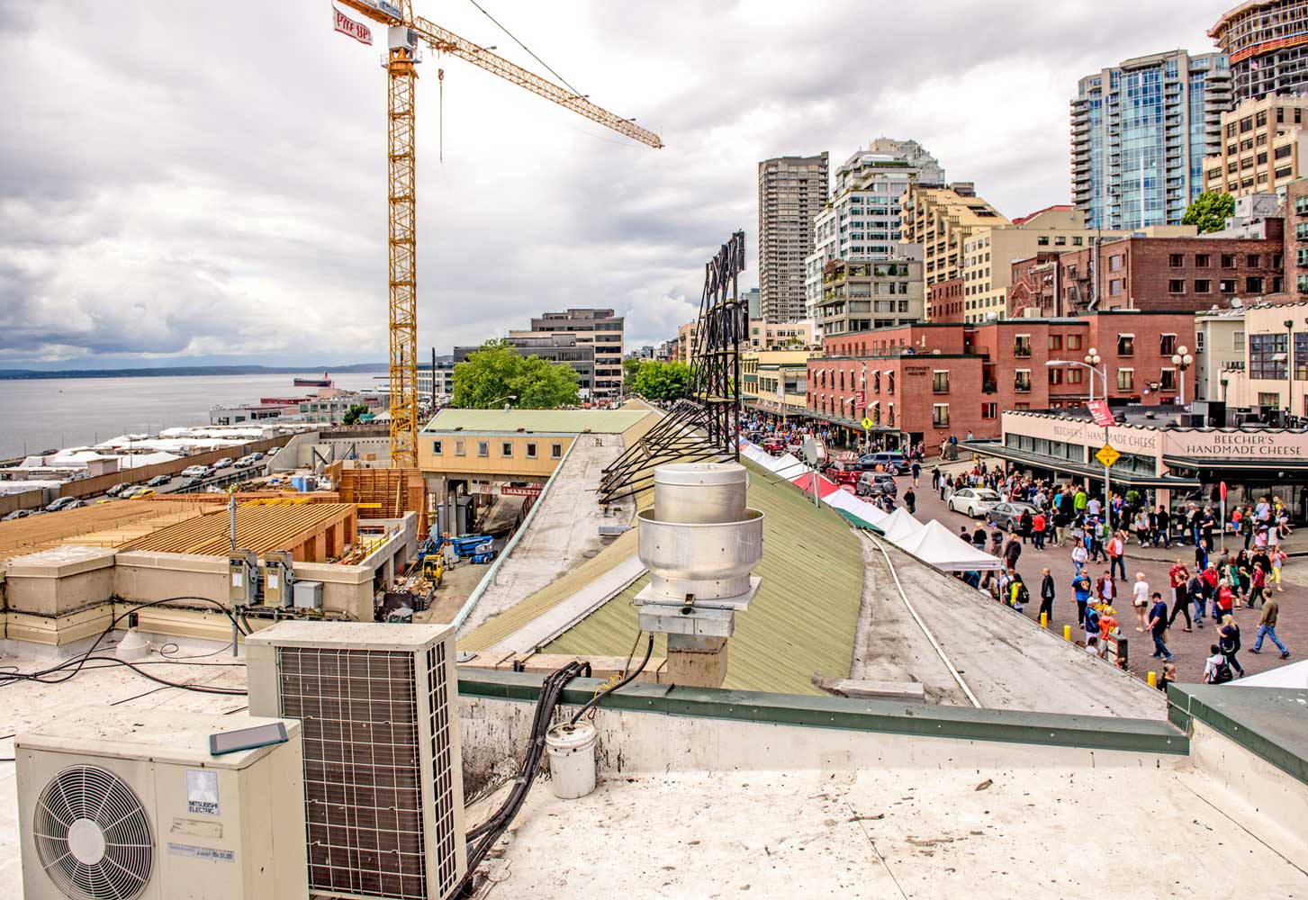 NOW: In the near-century since our “then,” the Arcade has added the Desimone Bridge over Western, left-center. On the right, the Belltown/Denny Regrade neighborhood is being increasingly stocked with the high-rises envisioned by the original regraders, and on the left, work-in-progress on the Municipal Market space, will blend the Public Market with the new waterfront, once it is revealed with the razing of the Alaskan Way Viaduct.