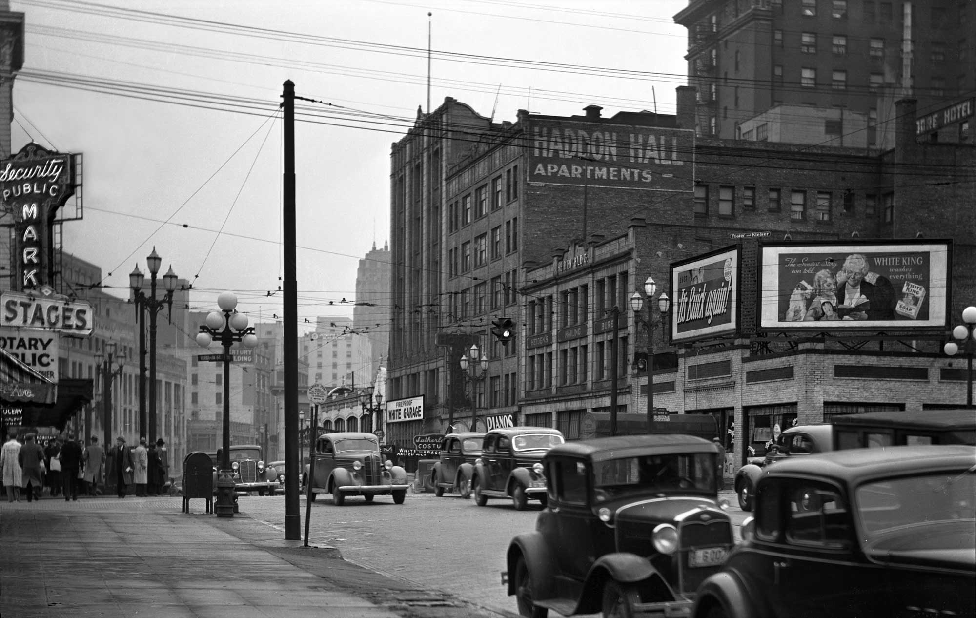 THEN: The five buildings shown here on the west side of Third Avenue south of Virginia Street have endured with few changes since the ‘then’ photo was snapped in 1936. The exception is the smallest, far-right, the Virginian Tavern now stripped for an open garage at Third’s southwest corner with Virginia Street. The six-story Hardon Hall Apartments, at the center of the five, was renovated in 2006 for low-income housing by the Plymouth Housing Group.