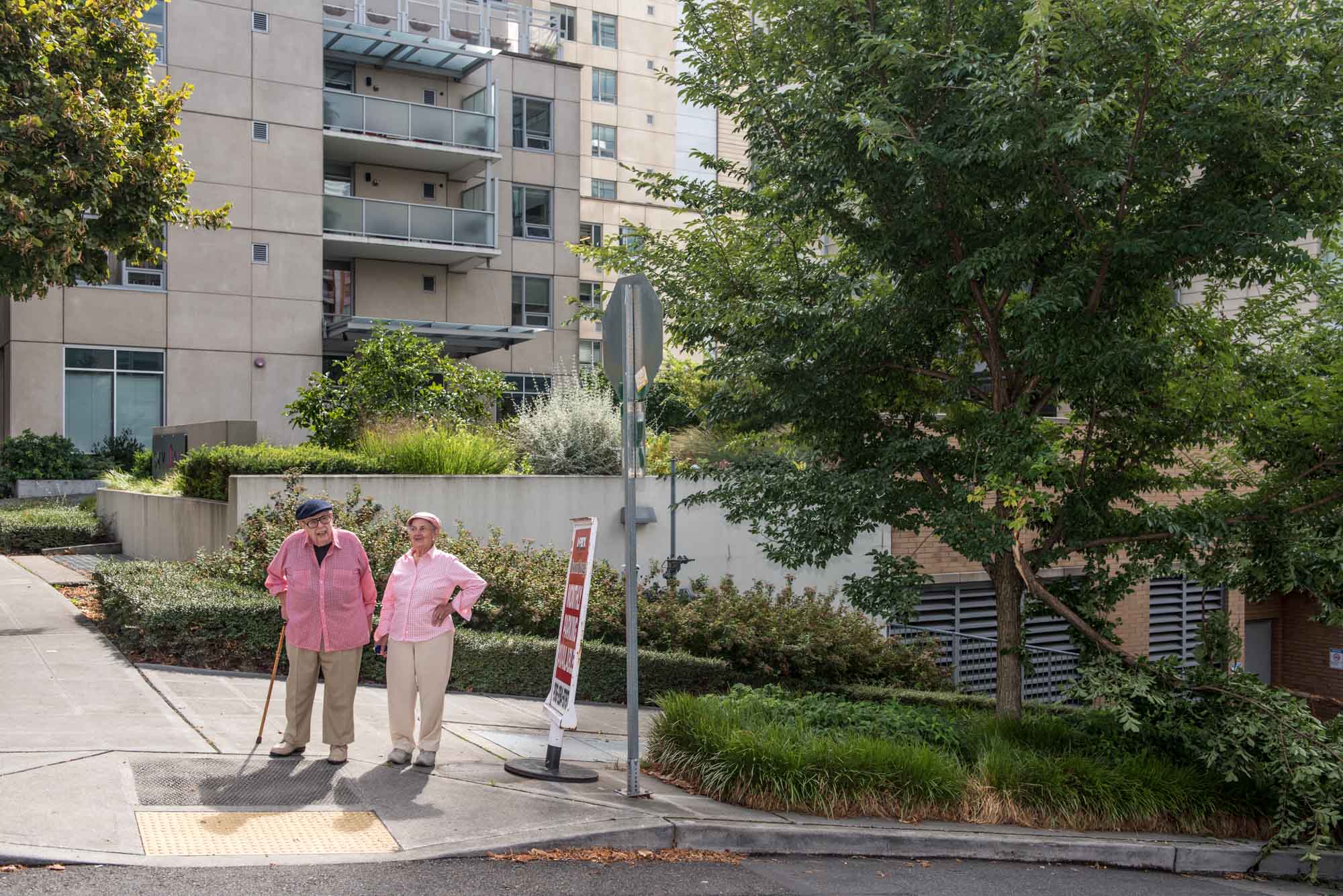 NOW: Posing here in the pink, Antonette and Robert Ruppin, long-time florists for the Bon Marche department store, are the oldest residents of the First Hill block that was once home for the Sunset Board Room (seen in the “then”) and the Capri Apartments at the northeast and southeast corners, respectively. The newlyweds left the Capri in the late 1950s but recently returned to the block to take occupancy on the 19th floor of Skyline, the new nonprofit that describes itself as “Seattle’s only Life Care retirement community.”