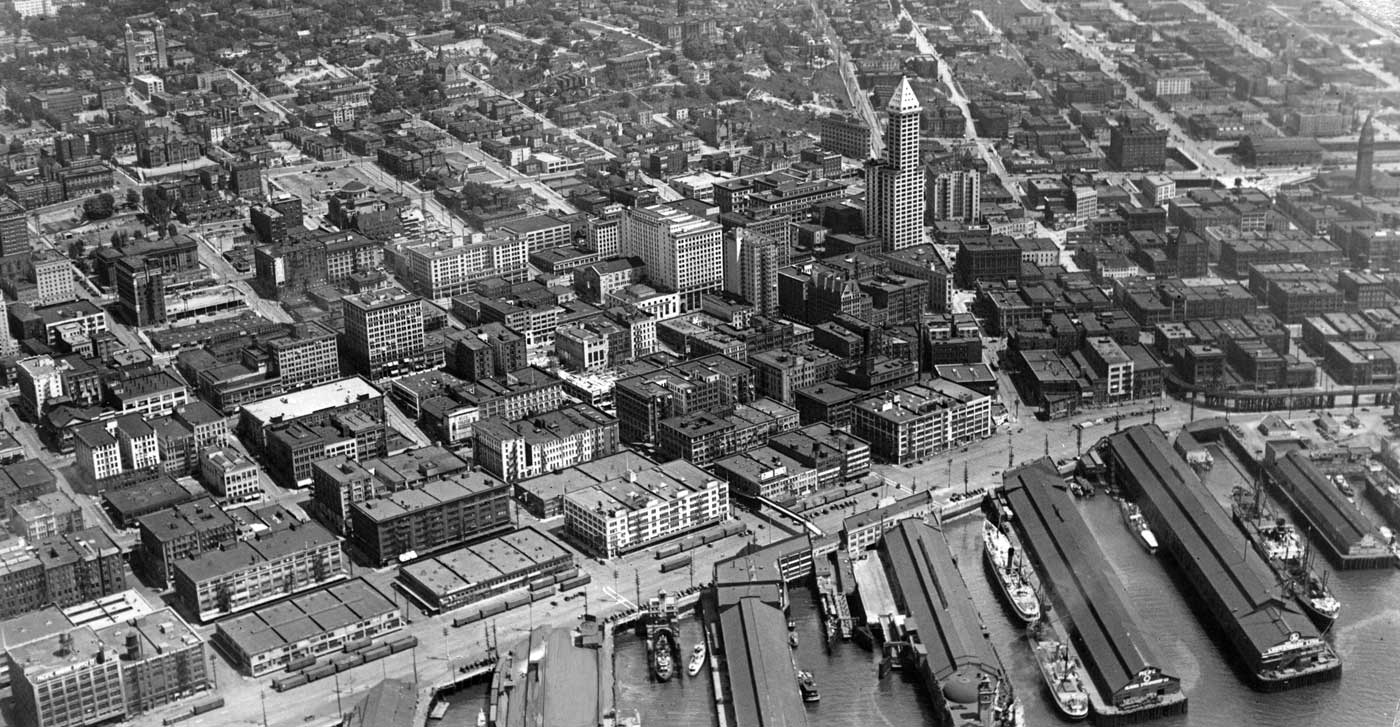 z-aerial-first-hill-1929-10k-j5-copyweb October 9, 2016 1400 × 727 Seattle Now & Then: ‘The Sunset Board Room’ A ca. 1929 snap of the waterfront, the lower business District and the profanity hill part of First Hill. The twin towers of St. James on the upper-left will easily lead you to the Kitty-corner block now home to Skyline.