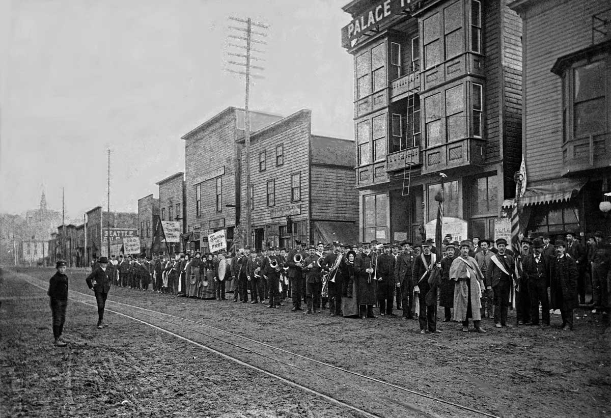 x-salvation-army-on-jackson-90s-web November 20, 2016 1200 × 821 Seattle Now & Then: Jackson St. and First Avenue South The Salvation Army band posing on Jackson Street in front of the Palace Theatre, possibly during or following a “battle of the bands” with the house orchestra. The subject looks east from Commercial Street (First Ave. S.).