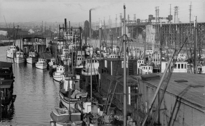 img0001428A January 8, 2017 677 × 415 Seattle Now & Then: The Ballard Fire Station ca. 1903 Ballard’s bascule bridge on 15th Ave. n.w. seen over the masts & stacks of Fishermen’s Terminal.